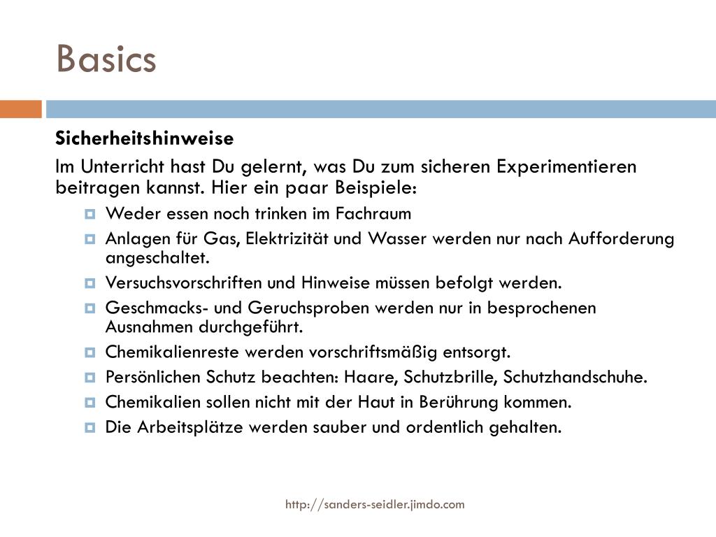 Basics Sicherheitshinweise Im Unterricht hast Du gelernt, was Du zum sicheren Experimentieren beitragen kannst. Hier ein paar Beispiele: • Weder essen noch trinken im Fachraum • Anlagen für Gas, Elektrizität und Wasser werden nur nach Aufforderung angeschaltet. • Versuchsvorschriften und Hinweise müssen befolgt werden. • Geschmacks- und Geruchsproben werden nur in besprochenen Ausnahmen durchgeführt. • Chemikalienreste werden vorschriftsmäßig entsorgt. • Persönlichen Schutz beachten: Haare, Schutzbrille, Schutzhandschuhe. • Chemikalien sollen nicht mit der Haut in Berührung kommen. • Die Arbeitsplätze werden sauber und ordentlich gehalten. http://sanders-seidler.jimdo.com