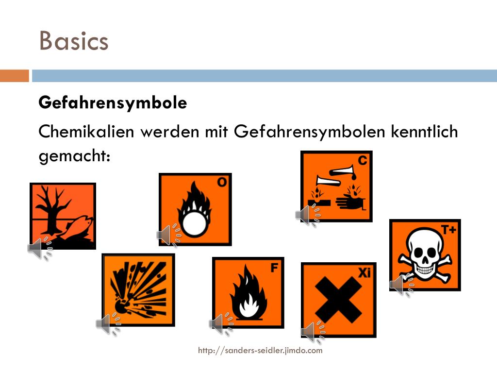 Basics Gefahrensymbole Chemikalien werden mit Gefahrensymbolen kenntlich gemacht: http://sanders-seidler.jimdo.com