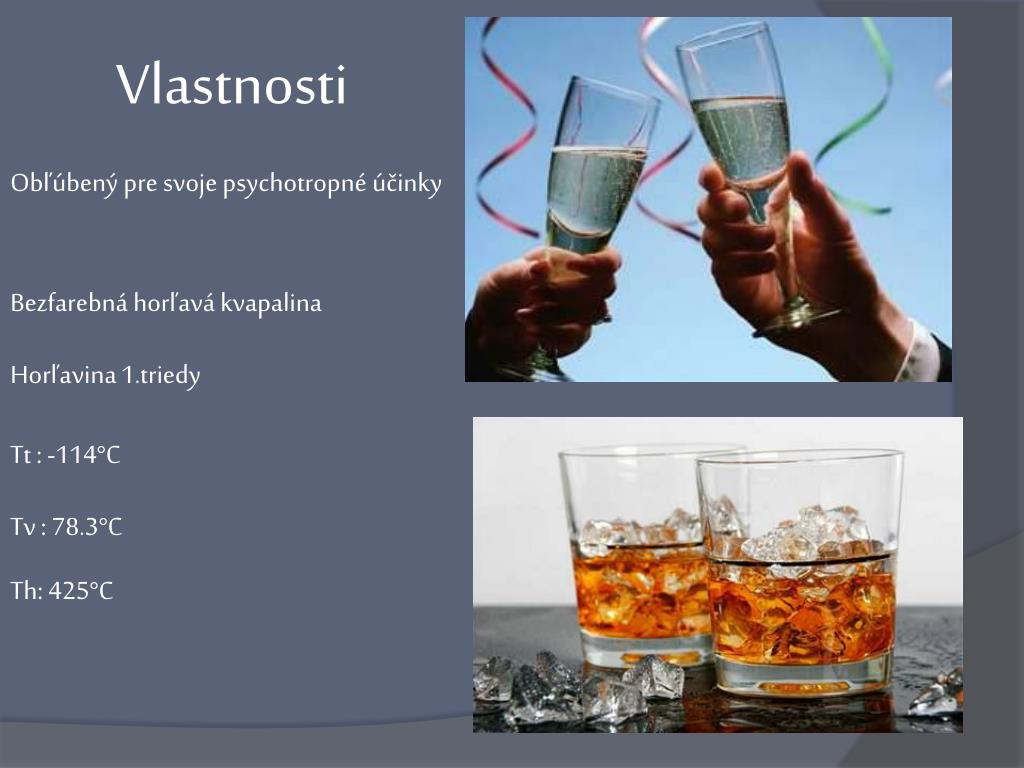 Vlastnosti Obľúbený pre svoje psychotropné účinky Bezfarebná horľavá kvapalina Horľavina1.triedy Tt : -114°C Tv : 78.3°C Th: 425°C