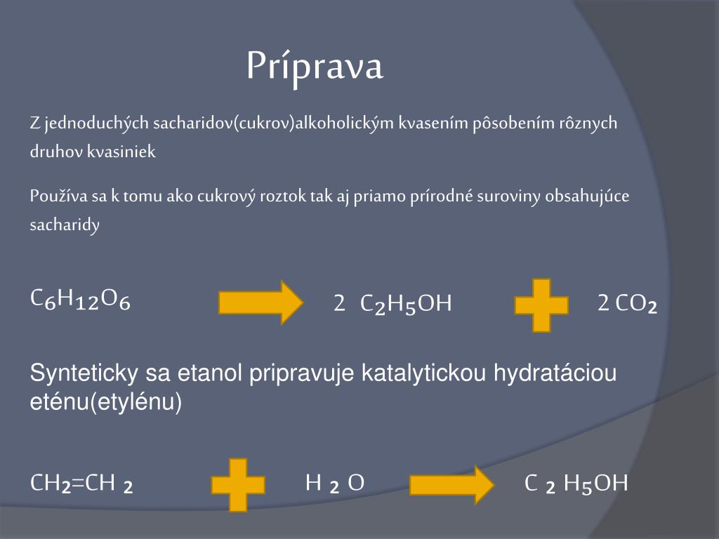 Príprava Z jednoduchých sacharidov(cukrov)alkoholickým kvasením pôsobením rôznych druhov kvasiniek Používa sa k tomu ako cukrový roztok tak aj priamo prírodné suroviny obsahujúce sacharidy C₆H₁₂O₆ 2 C₂H₅OH 2 CO₂ Synteticky sa etanol pripravuje katalytickou hydratáciou eténu(etylénu) CH₂=CH ₂ H ₂ O C ₂ H₅OH