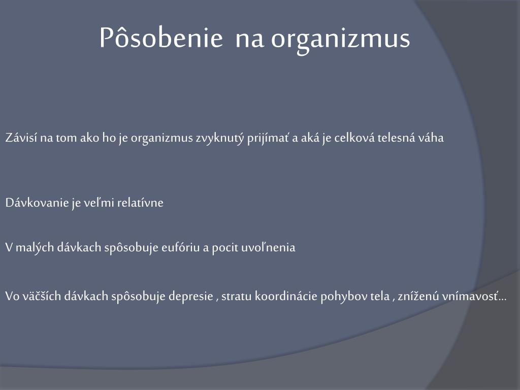 Pôsobeniena organizmus Závisí na tom ako ho je organizmus zvyknutý prijímať a aká je celková telesná váha Dávkovanie je veľmi relatívne V malých dávkach spôsobuje eufóriu a pocit uvoľnenia Vo väčších dávkach spôsobuje depresie , stratu koordinácie pohybov tela , zníženú vnímavosť...