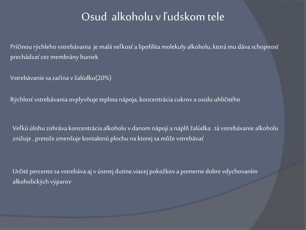 Osud alkoholu v ľudskom tele Príčinou rýchleho vstrebávania je malá veľkosť a lipofilita molekuly alkoholu, ktorá mu dáva schopnosť prechádzať cez membrány buniek Vstrebávanie sa začína v žalúdku(20%) Rýchlosť vstrebávania ovplyvňuje teplota nápoja, koncentrácia cukrov a oxidu uhličitého Veľkú úlohu zohráva koncentrácia alkoholu v danom nápoji a náplň žalúdka . tá vstrebávanie alkoholu znižuje , pretože zmenšuje kontaktnú plochu na ktorej sa môže vstrebávať Určité percento sa vstrebáva aj v ústnej dutine,viacejpokožkov a pomerne dobre vdychovaním alkoholických výparov