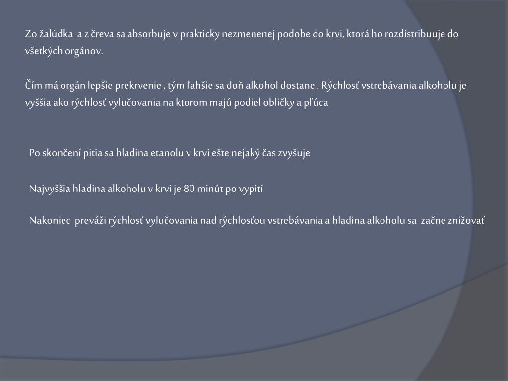 Štádia opitosti Normálna hranica alkoholu v krvi je 0,1 promine 0,3 - 0,5 ‰ svedčí o požití alkoholického nápoja 0,5 – 1 ‰znamená miernu podnapitosť 1.Stupeň – 1 – 1,5 ‰–človek je spokojný , družný , výrečný 2.Stupeň – 1,5 – 3 ‰– človek je nekritický netaktný , impulzívny a spieva 3.Stupeň – 3 ‰ a viac – človek je unavený,ospalý,zvracia,bledne