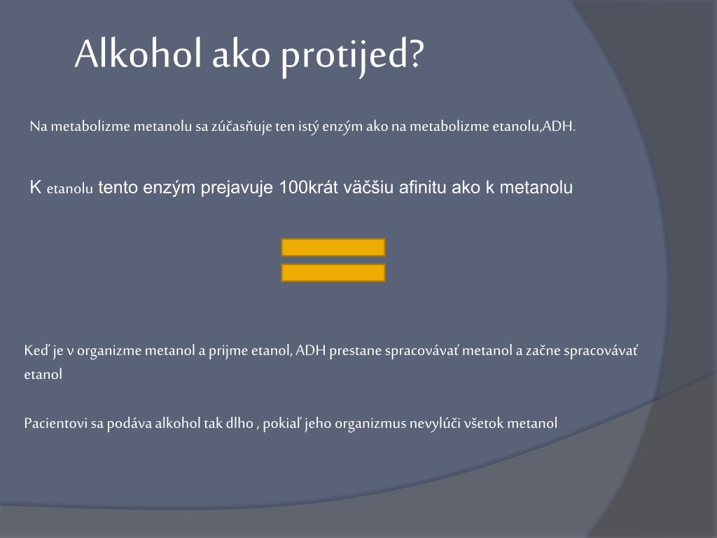 Alkohol ako protijed? Na metabolizme metanolu sa zúčasňuje ten istý enzým ako na metabolizme etanolu,ADH. K etanolu tento enzým prejavuje 100krát väčšiu afinitu ako k metanolu Keď je v organizme metanol a prijme etanol, ADH prestane spracovávať metanol a začne spracovávať etanol Pacientovi sa podáva alkohol tak dlho , pokiaľ jeho organizmus nevylúči všetok metanol