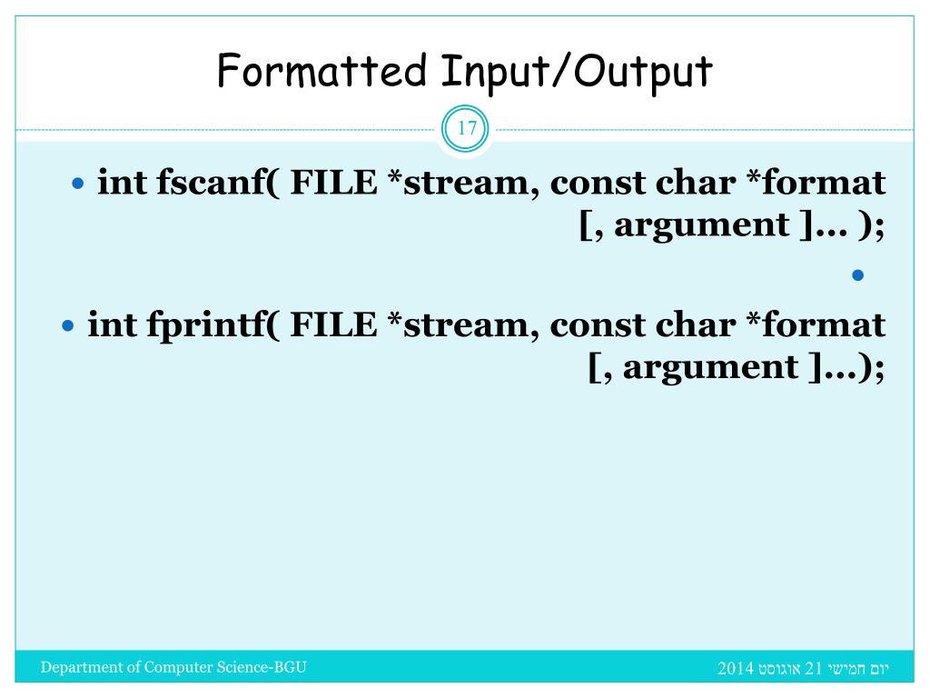 Formatted Input/Output • int fscanf( FILE *stream, const char *format [, argument ]... ); • int fprintf( FILE *stream, const char *format [, argument ]...); Department of Computer Science-BGU