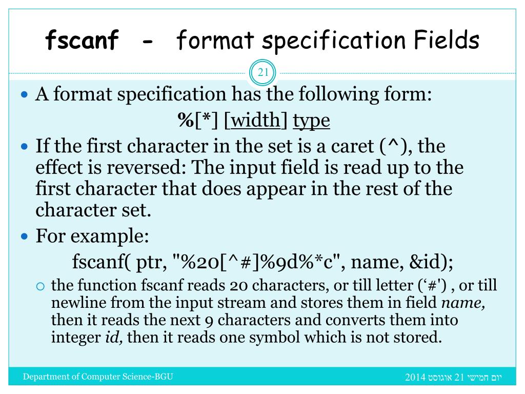fscanf - format specification Fields • A format specification has the following form: %[*] [width] type • If the first character in the set is a caret (^), the effect is reversed: The input field is read up to the first character that does appear in the rest of the character set. • For example: fscanf( ptr, "%20[^#]%9d%*c", name, &id); • the function fscanf reads 20 characters, or till letter (‘#') , or till newline from the input stream and stores them in field name, then it reads the next 9 characters and converts them into integer id, then it reads one symbol which is not stored. Department of Computer Science-BGU