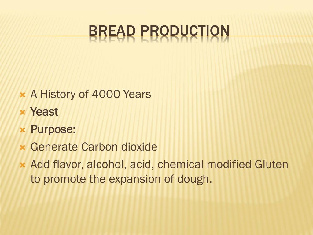 A History of 4000 Years Yeast Purpose: Generate Carbon dioxide Add flavor, alcohol, acid, chemical modified Gluten to promote the expansion of dough. Bread Production
