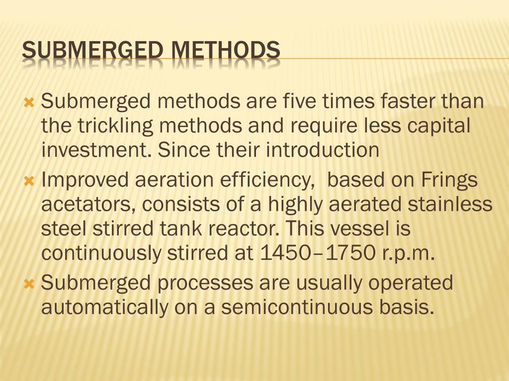 Submerged methods are five times faster than the trickling methods and require less capital investment. Since their introduction Improved aeration efficiency, based on Fringsacetators, consists of a highly aerated stainless steel stirred tank reactor. This vessel is continuously stirred at 1450–1750 r.p.m. Submerged processes are usually operated automatically on a semicontinuous basis. SUBMERGED METHODS