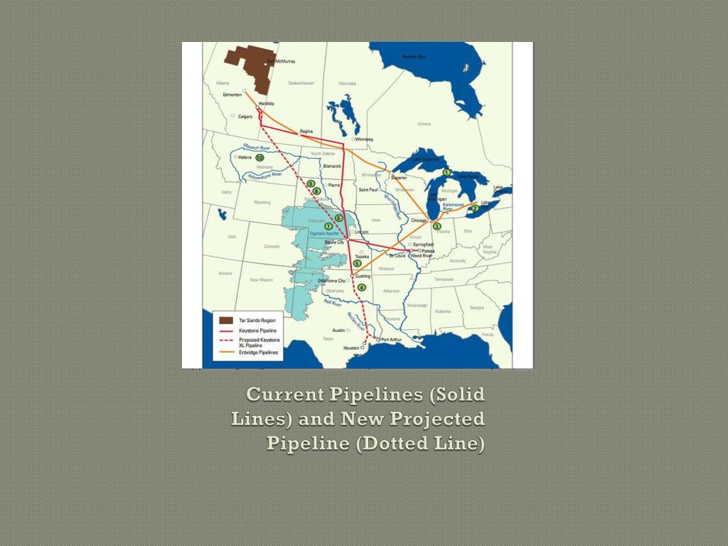 Predicted Pipeline • Owned by Keystone XL • It will run 1700 miles from Alberta to the refinery in Texas and will open in 2013 • Underground • Cut through Nebraska • Problems/Issue • Cuts through Nebraska Sand Hills which has porous, fine sands and will cross over the Ogallala Aquifer If a spill happens over the aquifer, it will pollute water that is supplied to 2,000,000+ people Frevert, Malinda. “New Tar Sands Oil Products Increase Likelihood of Spills." Bold Nebraska. Bold Nebraska, 16/02/2011. Web. 13 apr 2011. <http://www.boldnebraska.org/ pipeline-problems>. "No to a New Tar Sands Pipeline." New York Times. New York Times, 02/04/2011. Web. 13 Apr 2011. http://www.nytimes.com/2011/04/03/opinion/03sun1.html.