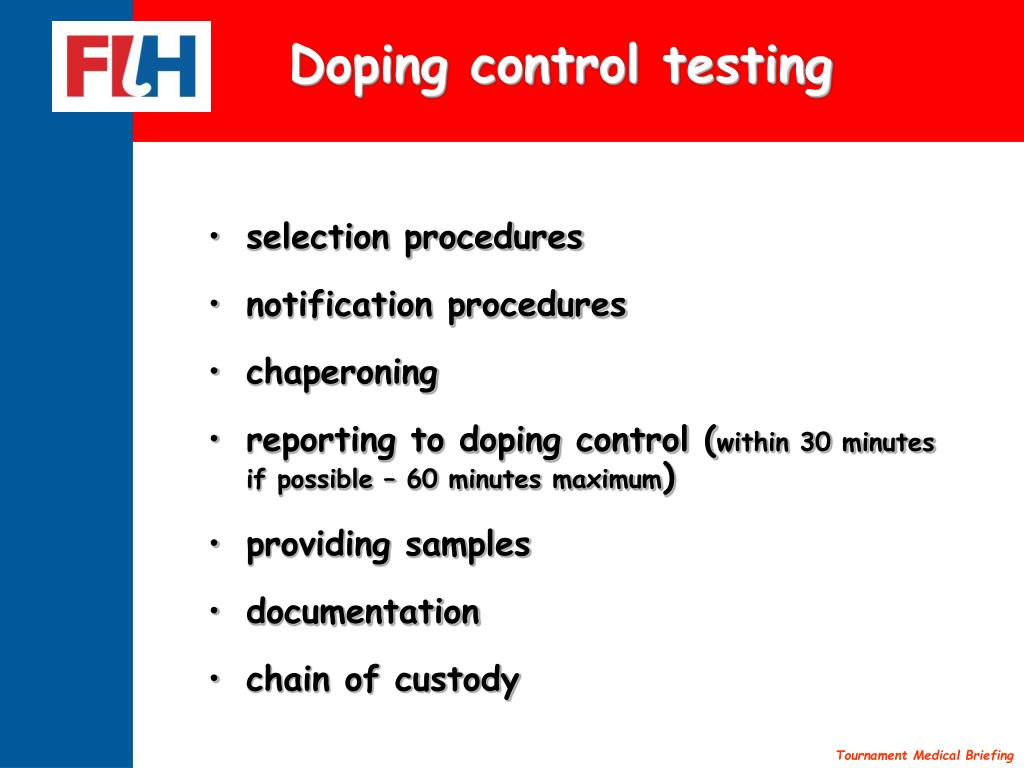 Doping control testing • selection procedures • notification procedures • chaperoning • reporting to doping control (within 30 minutes if possible – 60 minutes maximum) • providing samples • documentation • chain of custody