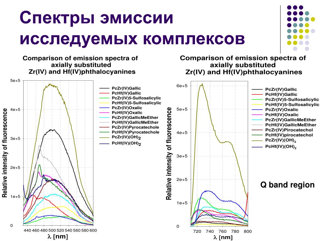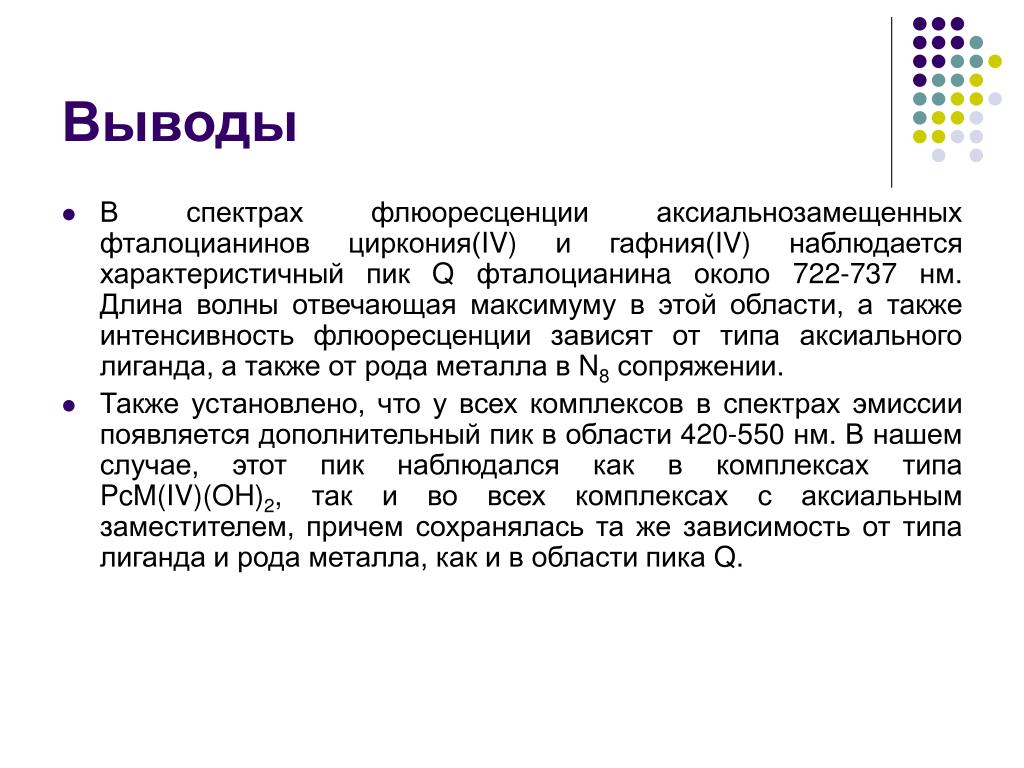 Выводы • В спектрах флюоресценции аксиальнозамещенных фталоцианинов циркония(IV) и гафния(IV) наблюдается характеристичный пик Q фталоцианинa около 722-737 нм. Длина волны отвечающая максимуму в этой области, а также интенсивность флюоресценции зависят от типа аксиального лиганда, а также от рода металла в N8 сопряжении. • Также установлено, что у всех комплексов в спектрах эмиссии появляется дополнительный пик в области 420-550 нм. В нашем случае, этот пик наблюдался как в комплексах типа PcM(IV)(OH)2, так и во всех комплексах с аксиальным заместителем, причем сохранялась та же зависимость от типа лиганда и рода металла, как и в области пика Q.