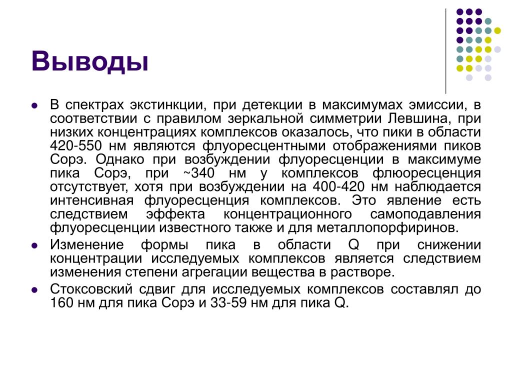 Выводы • В спектрах экстинкции, при детекции в максимумах эмиссии, в соответствии с правилом зеркальной симметрии Левшина, при низких концентрациях комплексов оказалось, что пики в области 420-550 нм являются флуоресцентными отображениями пиков Сорэ. Однако при возбуждении флуоресценции в максимуме пика Сорэ, при ~340 нм у комплексов флюоресценция отсутствует, хотя при возбуждении на 400-420 нм наблюдается интенсивная флуоресценция комплексов. Это явление есть следствием эффекта концентрационного самоподавления флуоресценции известного также и для металлопорфиринов. • Изменение формы пика в области Q при снижении концентрации исследуемых комплексов является следствием изменения степени агрегации вещества в растворе. • Стоксовский сдвиг для исследуемых комплексов составлял до 160 нм для пика Сорэ и 33-59 нм для пика Q.
