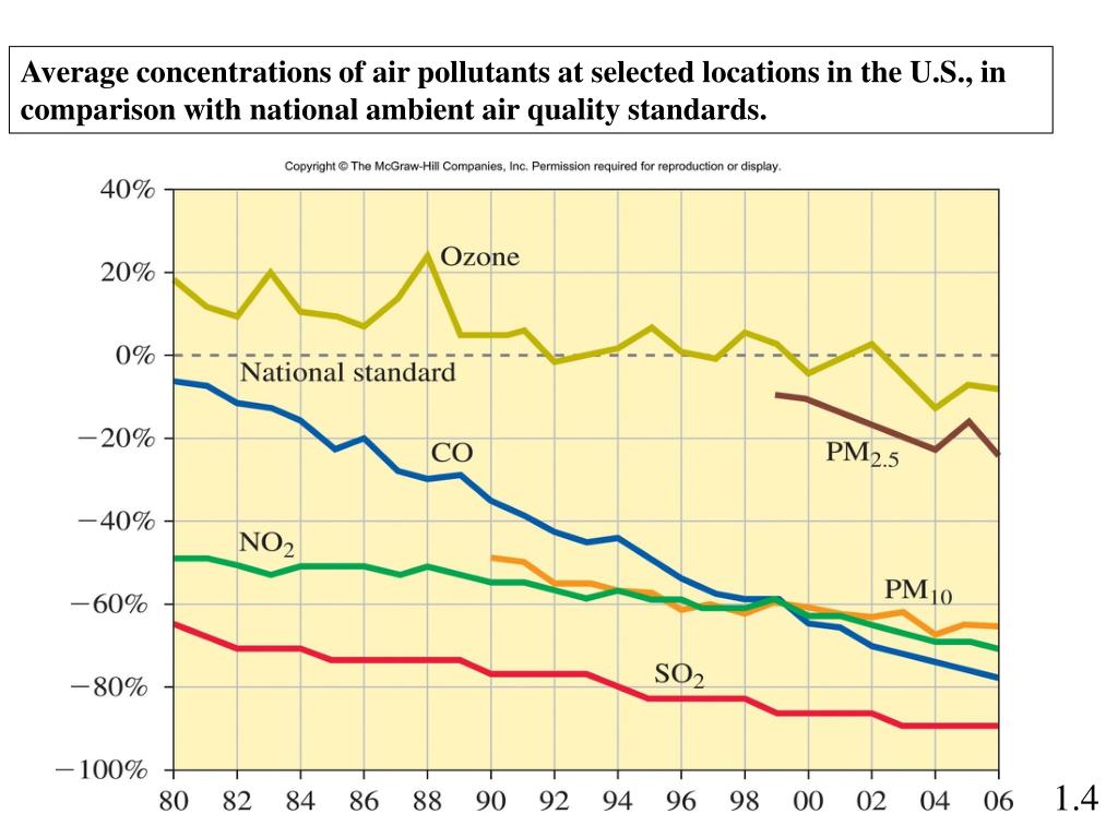 Average concentrations of air pollutants at selected locations in the U.S., in comparison with national ambient air quality standards. 1.4