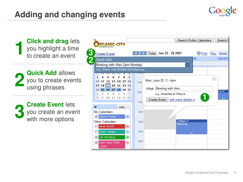 Adding and changing events Trythis:Add a new appointment • Using Click and drag, create an one-hour meeting tomorrow morning starting at 10am • Using Quick Add, create a lunch appointment with a co-worker from 12:30 to 1:00pm at Sidewalk Café on Friday • Using Create Event, set up a team meeting from 2:00pm to 2:45pm every Thursday