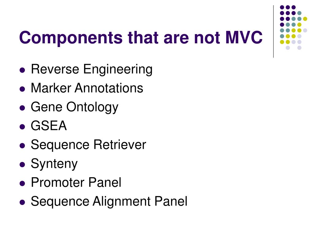 Components that are not MVC • Reverse Engineering • Marker Annotations • Gene Ontology • GSEA • Sequence Retriever • Synteny • Promoter Panel • Sequence Alignment Panel