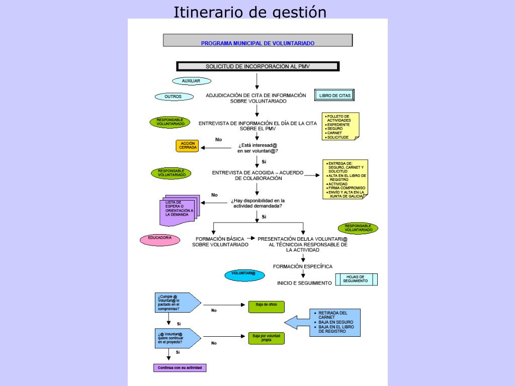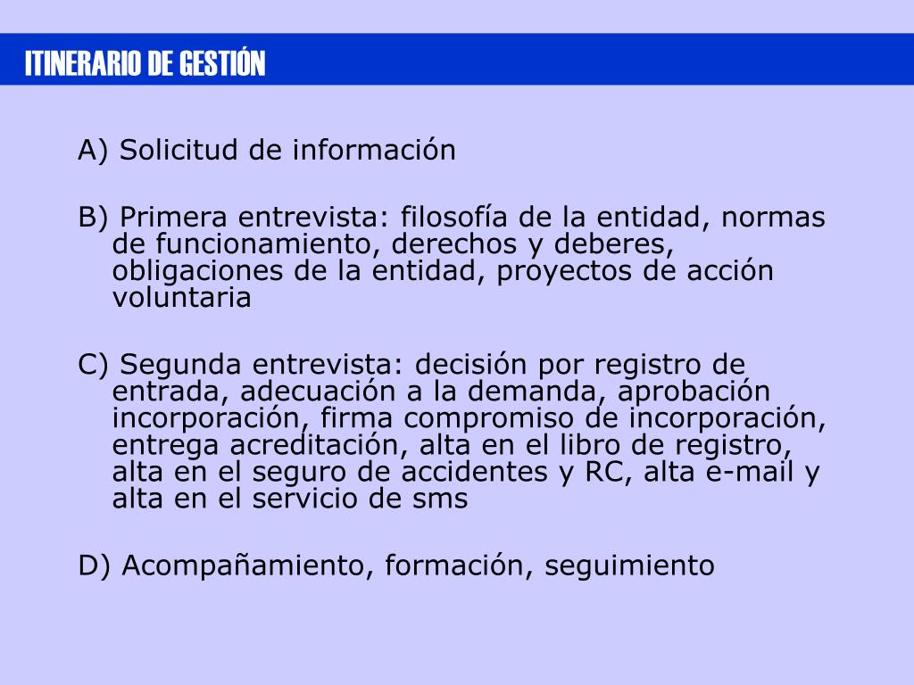 ITINERARIO DE GESTIÓN A) Solicitud de información B) Primera entrevista: filosofía de la entidad, normas de funcionamiento, derechos y deberes, obligaciones de la entidad, proyectos de acción voluntaria C) Segunda entrevista: decisión por registro de entrada, adecuación a la demanda, aprobación incorporación, firma compromiso de incorporación, entrega acreditación, alta en el libro de registro, alta en el seguro de accidentes y RC, alta e-mail y alta en el servicio de sms D) Acompañamiento, formación, seguimiento