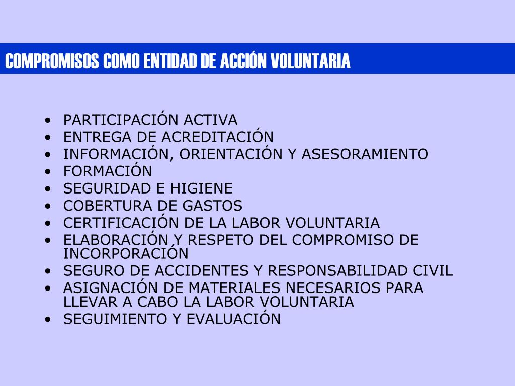 COMPROMISOS COMO ENTIDAD DE ACCIÓN VOLUNTARIA • PARTICIPACIÓN ACTIVA • ENTREGA DE ACREDITACIÓN • INFORMACIÓN, ORIENTACIÓN Y ASESORAMIENTO • FORMACIÓN • SEGURIDAD E HIGIENE • COBERTURA DE GASTOS • CERTIFICACIÓN DE LA LABOR VOLUNTARIA • ELABORACIÓN Y RESPETO DEL COMPROMISO DE INCORPORACIÓN • SEGURO DE ACCIDENTES Y RESPONSABILIDAD CIVIL • ASIGNACIÓN DE MATERIALES NECESARIOS PARA LLEVAR A CABO LA LABOR VOLUNTARIA • SEGUIMIENTO Y EVALUACIÓN