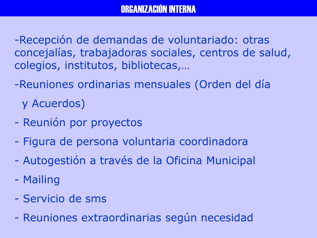ORGANIZACIÓN INTERNA • Recepción de demandas de voluntariado: otras concejalías, trabajadoras sociales, centros de salud, colegios, institutos, bibliotecas,… • Reuniones ordinarias mensuales (Orden del día • y Acuerdos) • Reunión por proyectos • Figura de persona voluntaria coordinadora • Autogestión a través de la Oficina Municipal • Mailing • Servicio de sms • Reuniones extraordinarias según necesidad