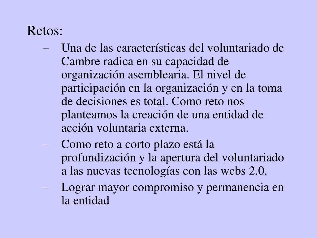 Retos: • Una de las características del voluntariado de Cambre radica en su capacidad de organización asemblearia. El nivel de participación en la organización y en la toma de decisiones es total. Como reto nos planteamos la creación de una entidad de acción voluntaria externa. • Como reto a corto plazo está la profundización y la apertura del voluntariado a las nuevas tecnologías con las webs 2.0. • Lograr mayor compromiso y permanencia en la entidad