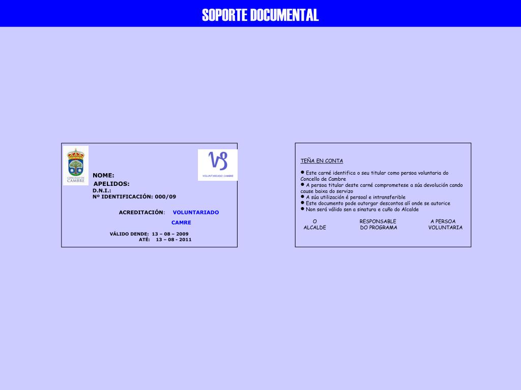 SOPORTE DOCUMENTAL • TEÑA EN CONTA • Este carné identifica o seu titular como persoa voluntaria do Concello de Cambre • A persoa titular deste carné comprometese a súa devolución cando cause baixa do servizo • A súa utilización é persoal e intransferible • Este documento pode outorgar descontos alí onde se autorice • Non será válido sen a sinatura e cuño do Alcalde • O RESPONSABLE A PERSOA • ALCALDE DO PROGRAMA VOLUNTARIA NOME: APELIDOS: D.N.I.: Nº IDENTIFICACIÓN: 000/09 ACREDITACIÓN: VOLUNTARIADO CAMRE VÁLIDO DENDE: 13 – 08 – 2009 ATÉ: 13 – 08 - 2011