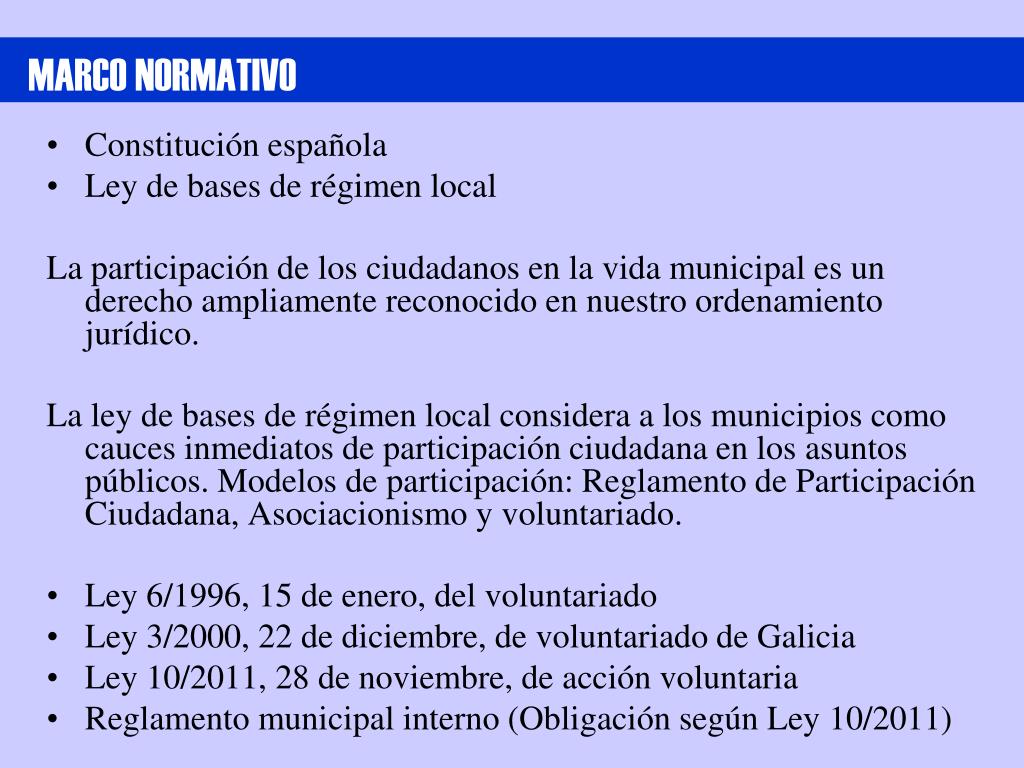 MARCO NORMATIVO • Constitución española • Ley de bases de régimen local La participación de los ciudadanos en la vida municipal es un derecho ampliamente reconocido en nuestro ordenamiento jurídico. La ley de bases de régimen local considera a los municipios como cauces inmediatos de participación ciudadana en los asuntos públicos. Modelos de participación: Reglamento de Participación Ciudadana, Asociacionismo y voluntariado. • Ley 6/1996, 15 de enero, del voluntariado • Ley 3/2000, 22 de diciembre, de voluntariado de Galicia • Ley 10/2011, 28 de noviembre, de acción voluntaria • Reglamento municipal interno (Obligación según Ley 10/2011)