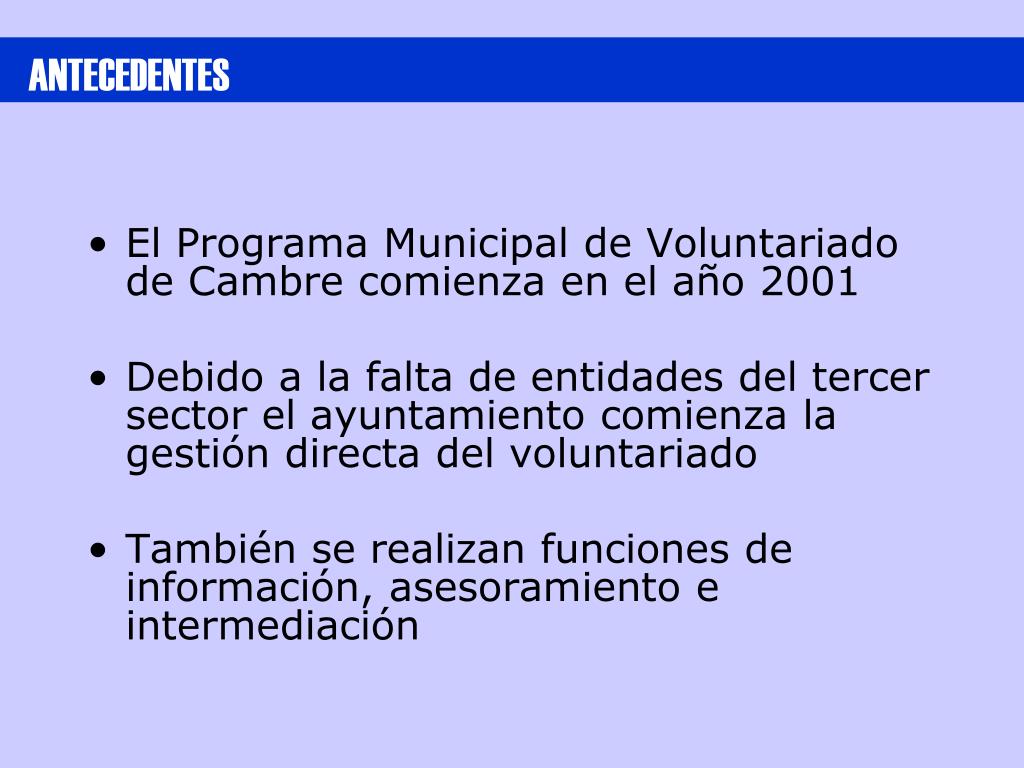 ANTECEDENTES • El Programa Municipal de Voluntariado de Cambre comienza en el año 2001 • Debido a la falta de entidades del tercer sector el ayuntamiento comienza la gestión directa del voluntariado • También se realizan funciones de información, asesoramiento e intermediación