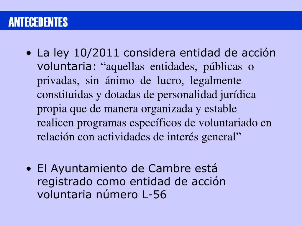 ANTECEDENTES • La ley 10/2011 considera entidad de acción voluntaria: “aquellas entidades, públicas o privadas, sin ánimo de lucro, legalmente constituidas y dotadas de personalidad jurídica propia que de manera organizada y estable realicen programas específicos de voluntariado en relación con actividades de interés general” • El Ayuntamiento de Cambre está registrado como entidad de acción voluntaria número L-56