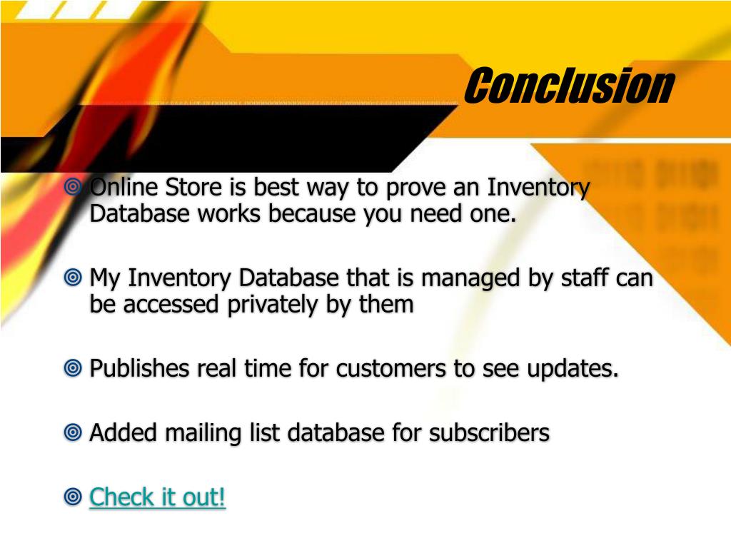 Conclusion • Online Store is best way to prove an Inventory Database works because you need one. • My Inventory Database that is managed by staff can be accessed privately by them • Publishes real time for customers to see updates. • Added mailing list database for subscribers • Check it out!
