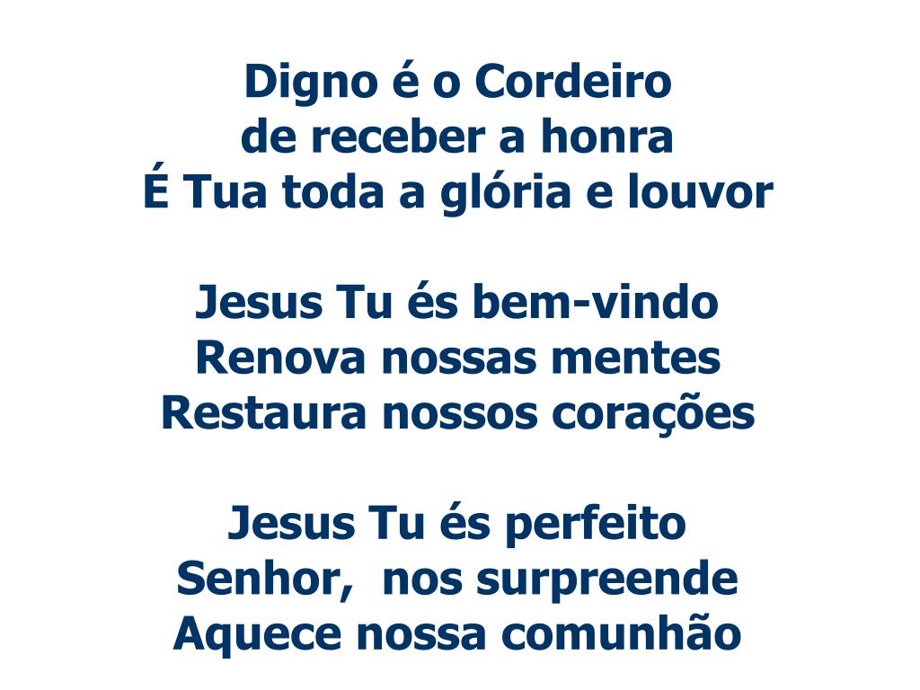 Digno é o Cordeiro de receber a honraÉ Tua toda a glória e louvorJesus Tu és bem-vindoRenova nossas mentesRestaura nossos coraçõesJesus Tu és perfeitoSenhor, nos surpreendeAquece nossa comunhão