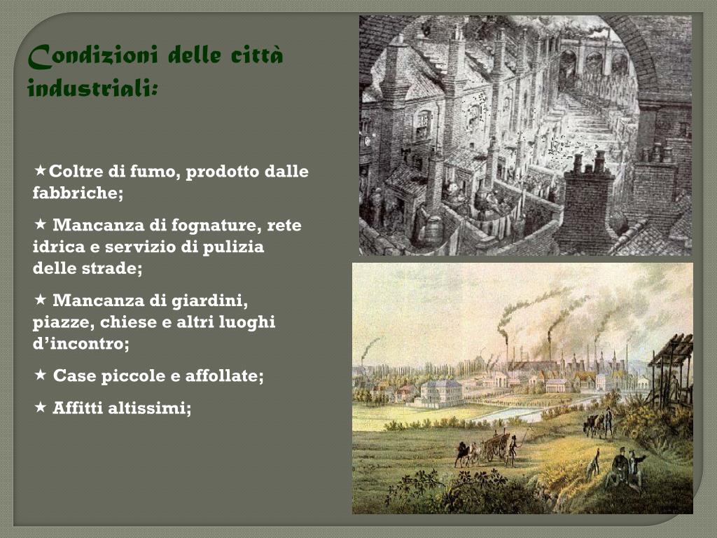 Condizioni delle città industriali: • Coltre di fumo, prodotto dalle fabbriche; • Mancanza di fognature, rete idrica e servizio di pulizia delle strade; • Mancanza di giardini, piazze, chiese e altri luoghi d’incontro; • Case piccole e affollate; • Affitti altissimi;