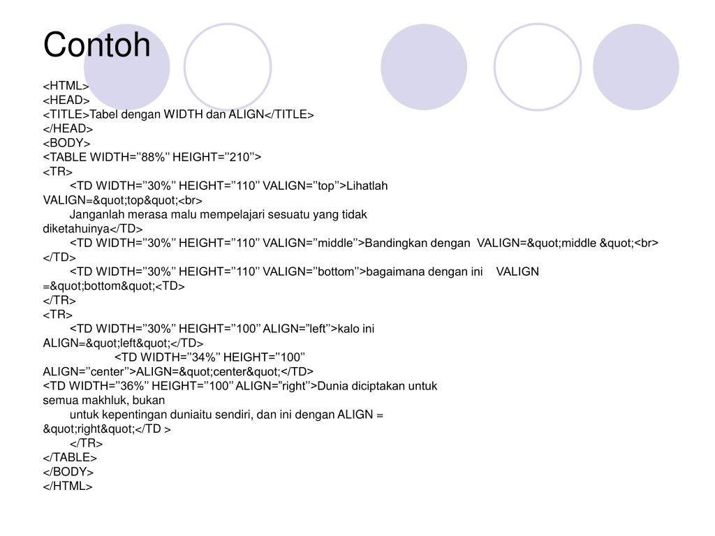 Contoh <HTML> <HEAD> <TITLE>Tabel dengan WIDTH dan ALIGN</TITLE> </HEAD> <BODY> <TABLE WIDTH=’’88%’’ HEIGHT=’’210’’> <TR> <TD WIDTH=’’30%’’ HEIGHT=’’110’’ VALIGN=’’top’’>Lihatlah VALIGN="top"<br> Janganlah merasa malu mempelajari sesuatu yang tidak diketahuinya</TD> <TD WIDTH=’’30%’’ HEIGHT=’’110’’ VALIGN=’’middle’’>Bandingkan dengan VALIGN="middle "<br> </TD> <TD WIDTH=’’30%’’ HEIGHT=’’110’’ VALIGN=’’bottom’’>bagaimana dengan ini VALIGN ="bottom"<TD> </TR> <TR> <TD WIDTH=’’30%’’ HEIGHT=’’100’’ ALIGN=”left’’>kalo ini ALIGN="left"</TD> <TD WIDTH=’’34%’’ HEIGHT=’’100’’ ALIGN=’’center’’>ALIGN="center"</TD> <TD WIDTH=’’36%’’ HEIGHT=’’100’’ ALIGN=”right’’>Dunia diciptakan untuk semua makhluk, bukan untuk kepentingan duniaitu sendiri, dan ini dengan ALIGN = "right"</TD > </TR> </TABLE> </BODY> </HTML>
