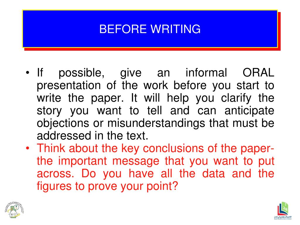BEFORE WRITING • If possible, give an informal ORAL presentation of the work before you start to write the paper. It will help you clarify the story you want to tell and can anticipate objections or misunderstandings that must be addressed in the text. • Think about the key conclusions of the paper- the important message that you want to put across. Do you have all the data and the figures to prove your point?