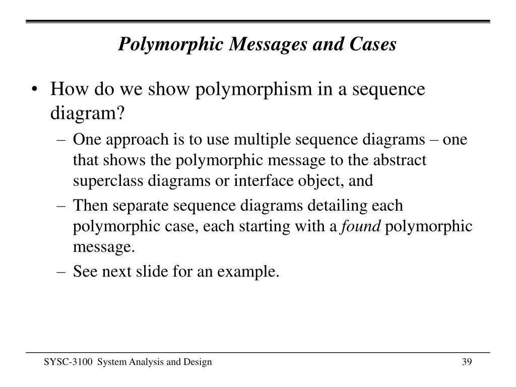 Polymorphic Messages and Cases • How do we show polymorphism in a sequence diagram? • One approach is to use multiple sequence diagrams – one that shows the polymorphic message to the abstract superclass diagrams or interface object, and • Then separate sequence diagrams detailing each polymorphic case, each starting with a found polymorphic message. • See next slide for an example. SYSC-3100 System Analysis and Design