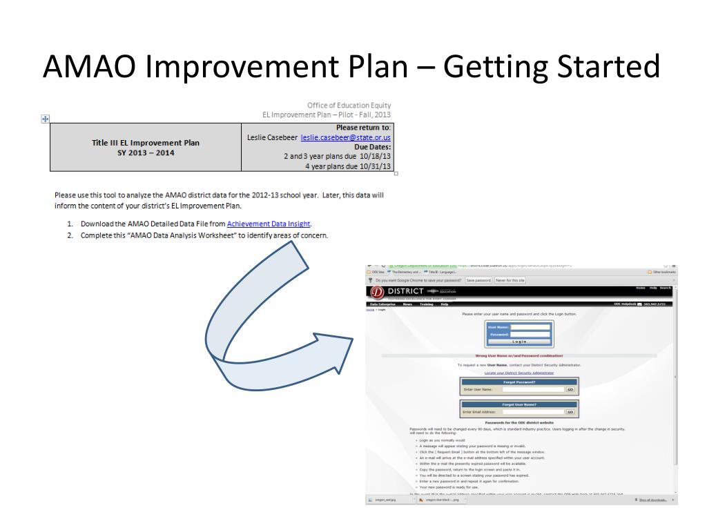 AMAO Improvement Plan Recommendations Particulars Please submit an electronic copy to Leslie Casebeer by: Oct. 18 for 2/3 year plans Oct. 31 for 4 year plans For technical assistance reach out to: Kim Miller Martha Martinez Rudyane Rivera Lindstrom Tim Blackburn • The Improvement Plan team is a critical component to ensuring that this process culminate in meaningful growth. • Avoiding silos – • Ensure connection to district goals • Connection to practice • Making sure stakeholders are aware of improvement plan to make sure plans become reality.