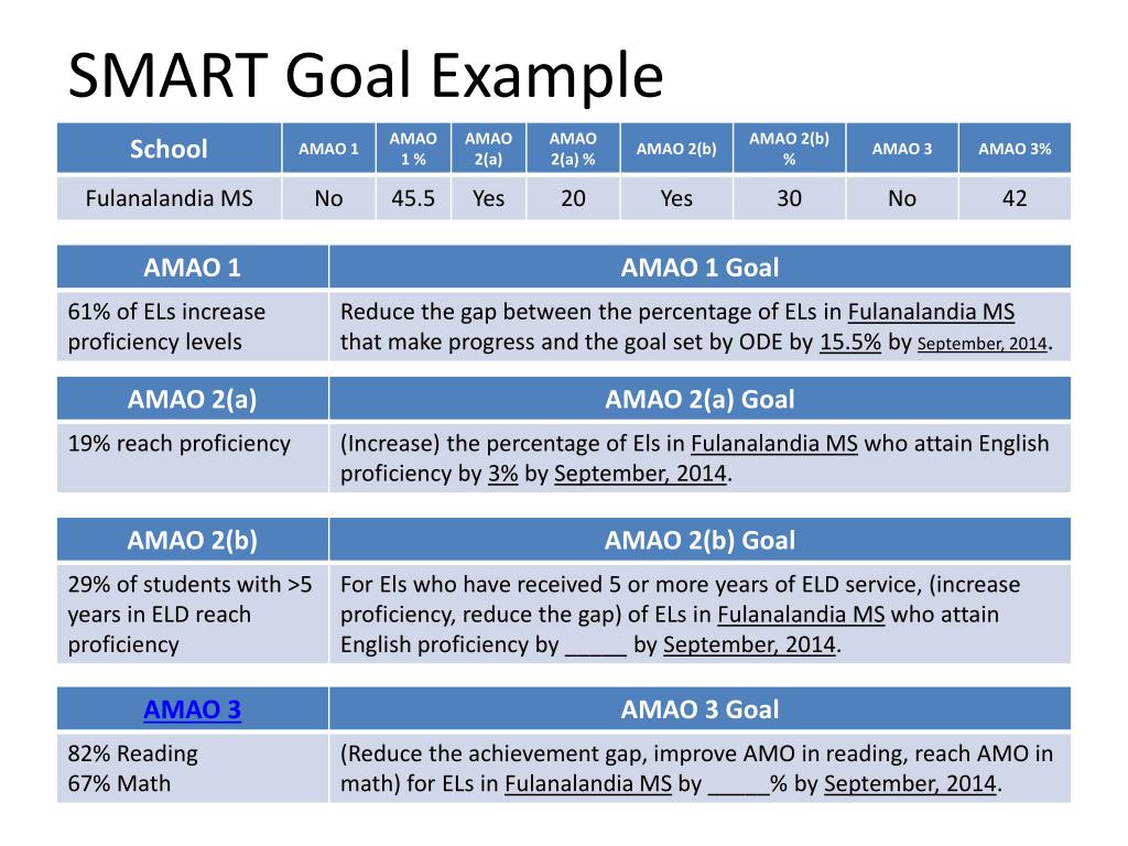 AMAO 101 Oregon Annual Measurable Achievement Objective (AMAO) Targets For more info… • Districts must meet all three AMAOs each year in order to meet the Title III accountability requirements. • AMAO 1 • 61% of EL students in Oregon move up by one level of English proficiency • AMAO 2(a) • at least 19% of all EL students in district reach proficiency and exit the program • AMAO 2(b) • at least 29% of EL students identified for five years or more reach proficiency and exit the program • AMAO 3 • EL subgroup has met the AMO • Reading – 82% • Math – 67%