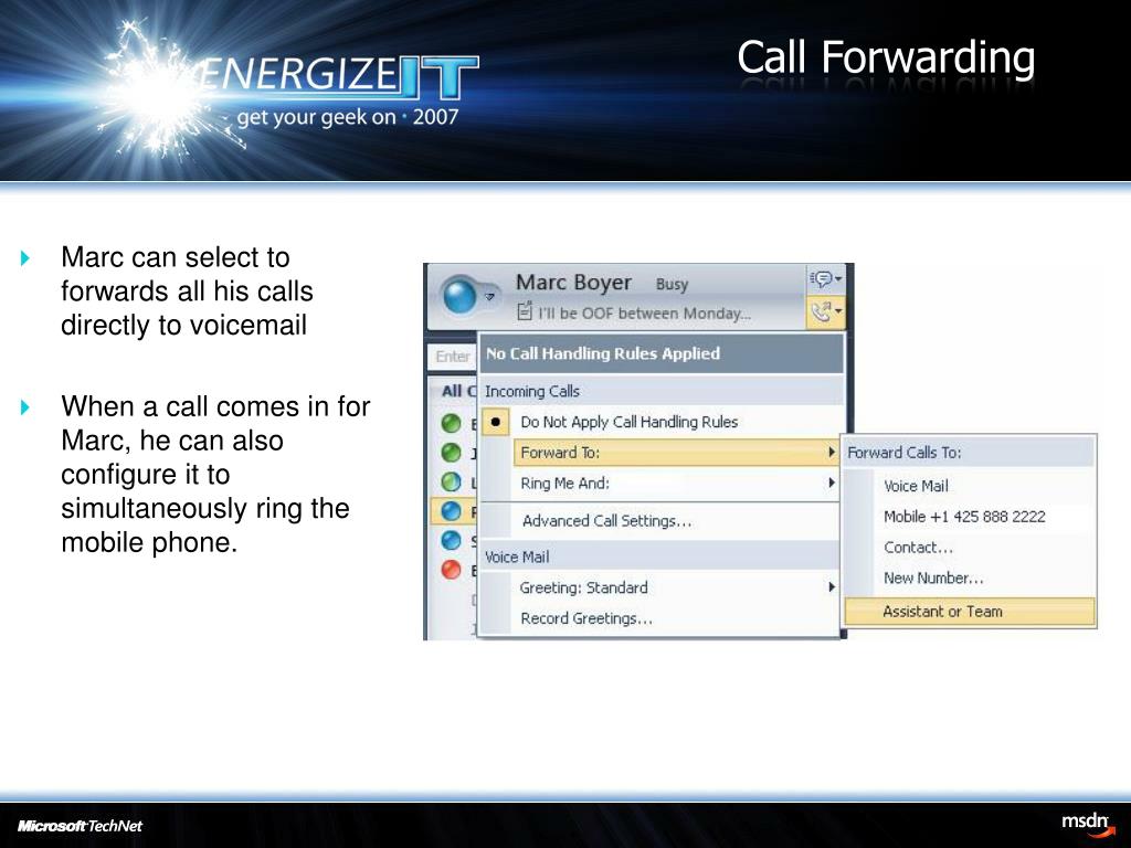 Call Forwarding Marc can select to forwards all his calls directly to voicemail When a call comes in for Marc, he can also configure it to simultaneously ring the mobile phone.