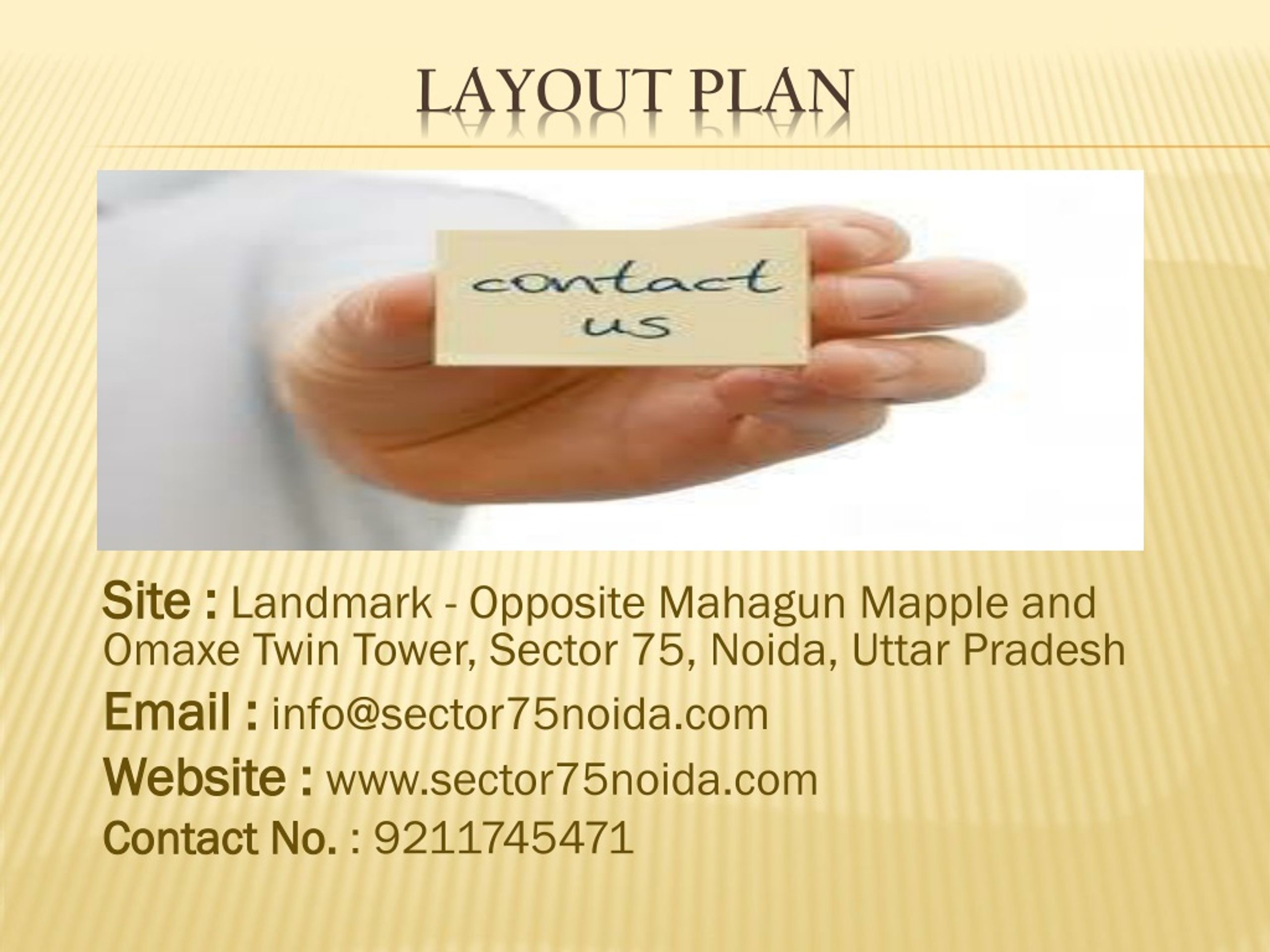 Site : Landmark - Opposite Mahagun Mapple and Omaxe Twin Tower, Sector 75, Noida, Uttar Pradesh Email : info@sector75noida.com Website : www.sector75noida.com Contact No. : 9211745471 LAYOUT PLAN