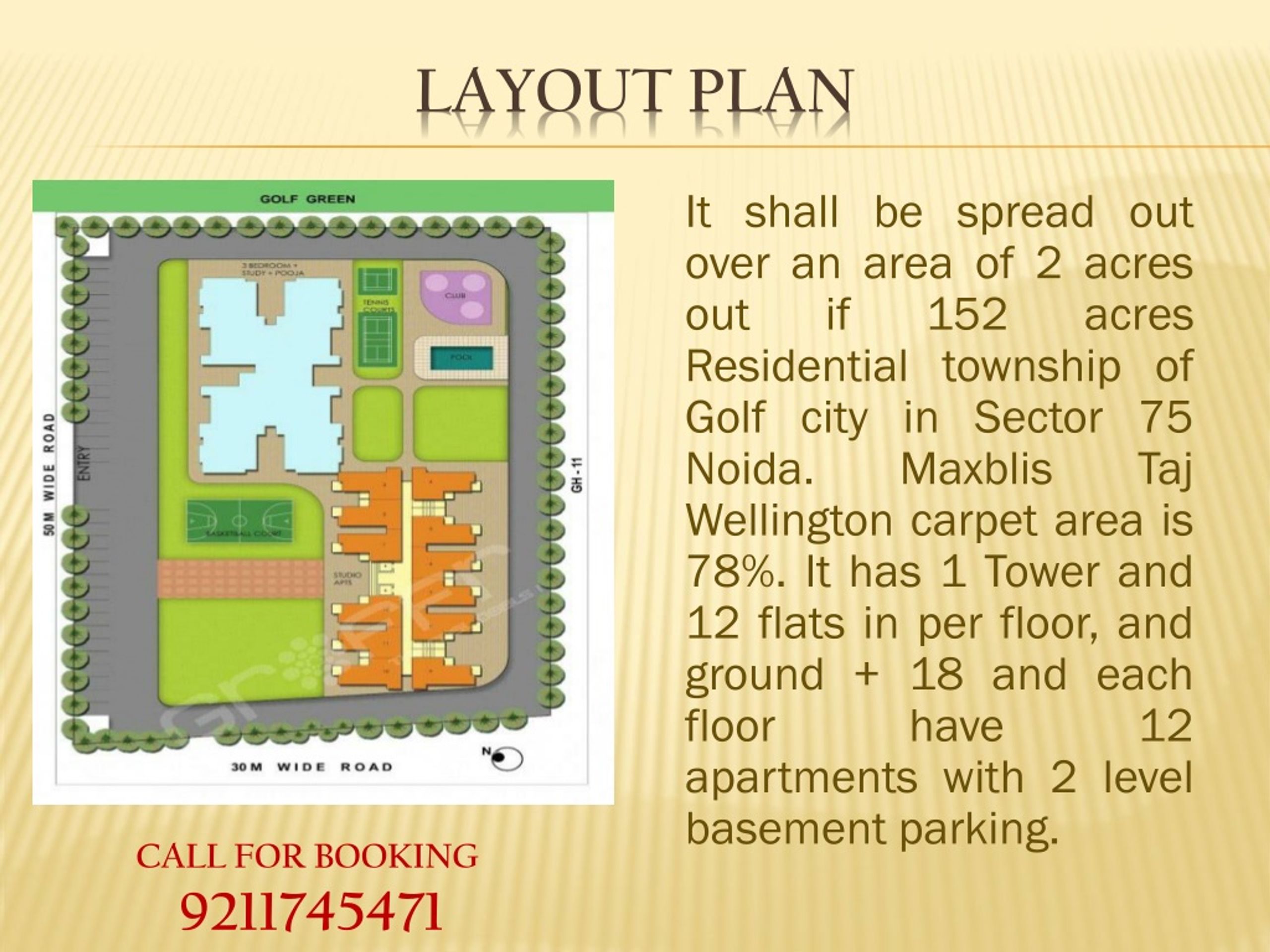 It shall be spread out over an area of 2 acres out if 152 acres Residential township of Golf city in Sector 75 Noida. MaxblisTaj Wellington carpet area is 78%. It has 1 Tower and 12 flats in per floor, and ground + 18 and each floor have 12 apartments with 2 level basement parking. LAYOUT PLAN CALL FOR BOOKING 9211745471