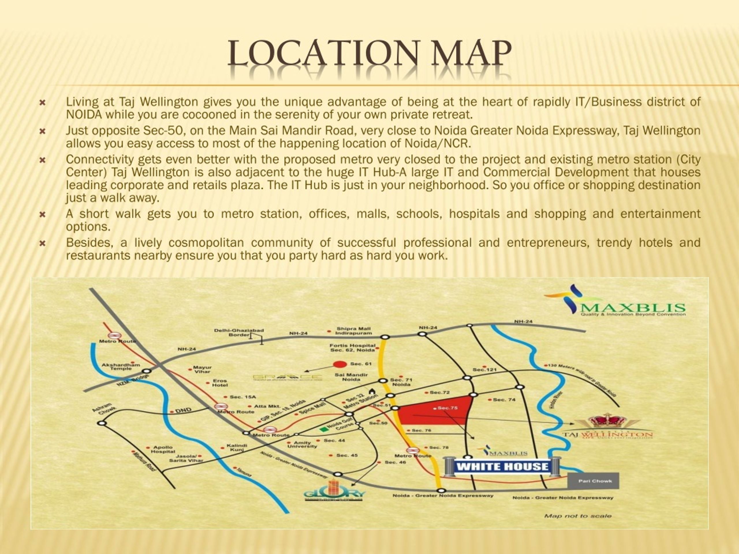 Living at Taj Wellington gives you the unique advantage of being at the heart of rapidly IT/Business district of NOIDA while you are cocooned in the serenity of your own private retreat. Just opposite Sec-50, on the Main SaiMandir Road, very close to Noida Greater Noida Expressway, Taj Wellington allows you easy access to most of the happening location of Noida/NCR. Connectivity gets even better with the proposed metro very closed to the project and existing metro station (City Center) Taj Wellington is also adjacent to the huge IT Hub-A large IT and Commercial Development that houses leading corporate and retails plaza. The IT Hub is just in your neighborhood. So you office or shopping destination just a walk away. A short walk gets you to metro station, offices, malls, schools, hospitals and shopping and entertainment options. Besides, a lively cosmopolitan community of successful professional and entrepreneurs, trendy hotels and restaurants nearby ensure you that you party hard as hard you work. Location map