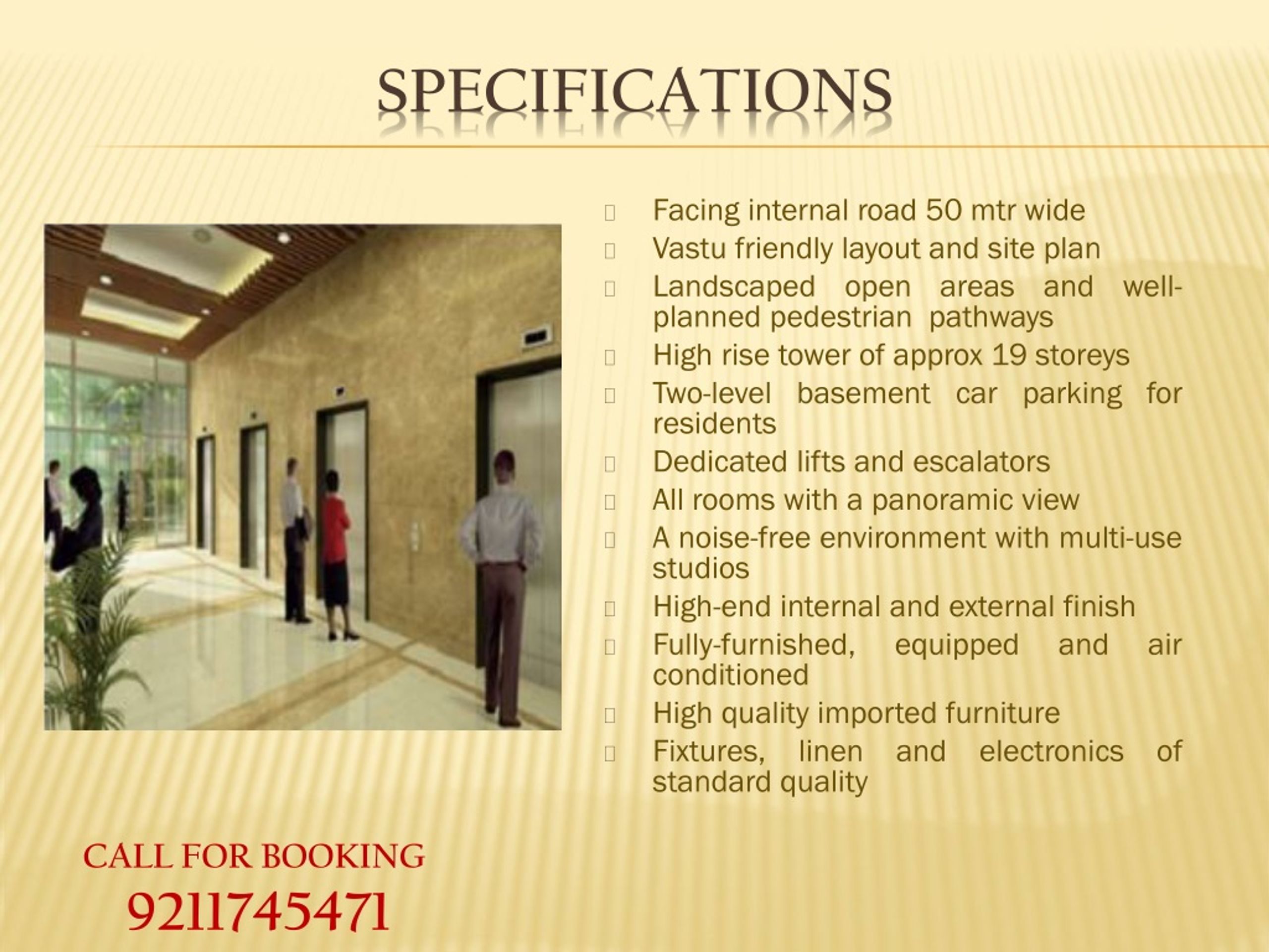 SPECIFICATIONS • Facing internal road 50 mtr wide • Vastu friendly layout and site plan • Landscaped open areas and well-planned pedestrian pathways • High rise tower of approx 19 storeys • Two-level basement car parking for residents • Dedicated lifts and escalators • All rooms with a panoramic view • A noise-free environment with multi-use studios • High-end internal and external finish • Fully-furnished, equipped and air conditioned • High quality imported furniture • Fixtures, linen and electronics of standard quality CALL FOR BOOKING 9211745471