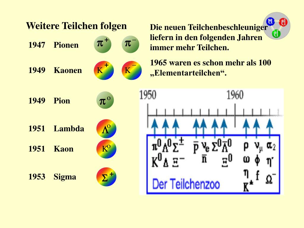 Weitere Teilchen folgen Die neuen Teilchenbeschleuniger liefern in den folgenden Jahren immer mehr Teilchen. 1965 waren es schon mehr als 100 „Elementarteilchen“. _ p + p 1947 Pionen _ + 1949 Kaonen K K K p o 1949 Pion o 1951 Lambda L o 1951 Kaon K + 1953 Sigma S