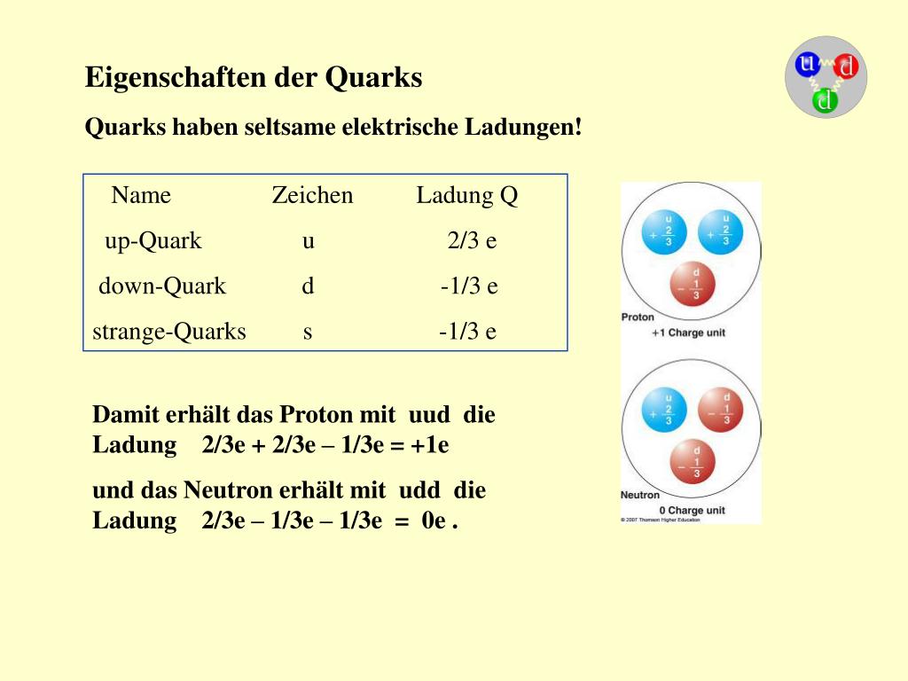 Eigenschaften der Quarks Quarks haben seltsame elektrische Ladungen! Name Zeichen Ladung Q up-Quark u 2/3 e down-Quark d -1/3 e strange-Quarks s -1/3 e Damit erhält das Proton mit uud die Ladung 2/3e + 2/3e – 1/3e = +1e und das Neutron erhält mit udd die Ladung 2/3e – 1/3e – 1/3e = 0e .