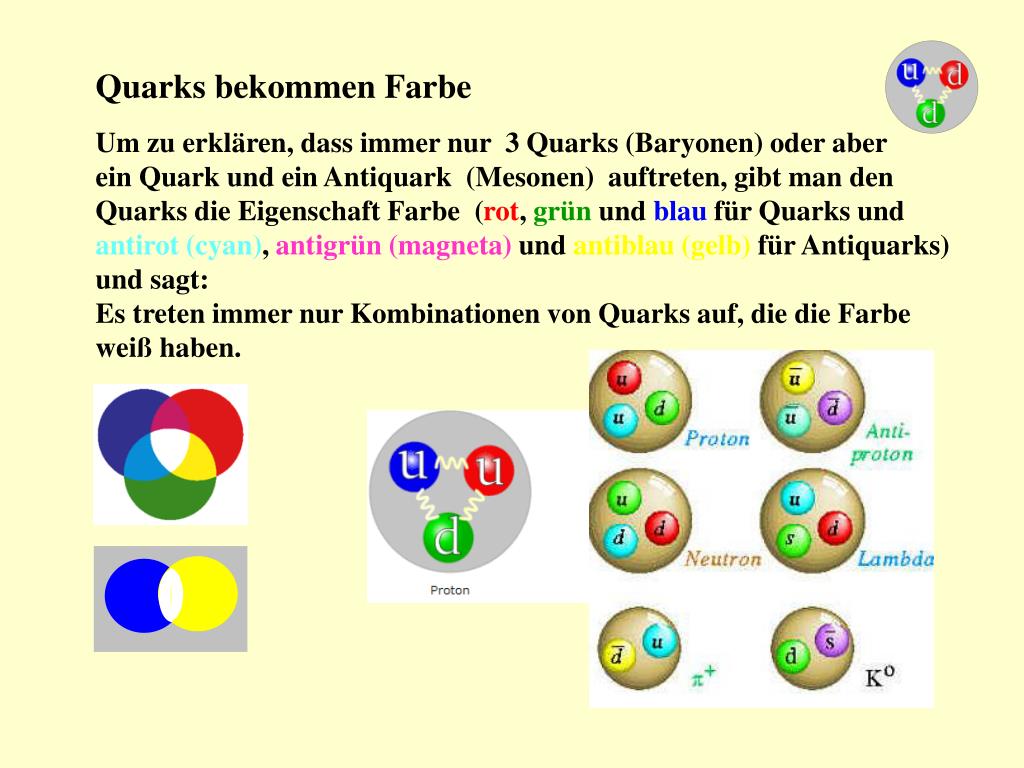 Quarks bekommen Farbe Um zu erklären, dass immer nur 3 Quarks (Baryonen) oder aber ein Quark und ein Antiquark (Mesonen) auftreten, gibt man den Quarks die Eigenschaft Farbe (rot, grün und blau für Quarks und antirot (cyan), antigrün (magneta) und antiblau (gelb) für Antiquarks) und sagt:Es treten immer nur Kombinationen von Quarks auf, die die Farbe weiß haben.