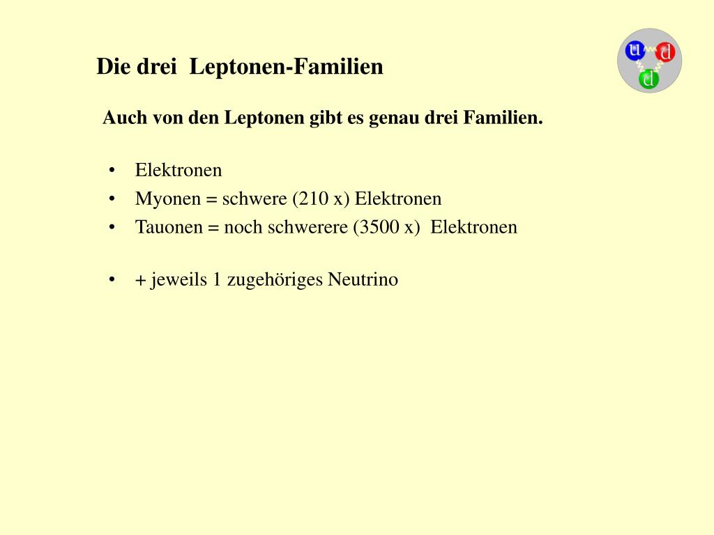 Die drei Leptonen-Familien Auch von den Leptonen gibt es genau drei Familien. • Elektronen • Myonen = schwere (210 x) Elektronen • Tauonen = noch schwerere (3500 x) Elektronen • + jeweils 1 zugehöriges Neutrino