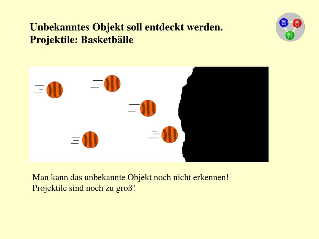 Unbekanntes Objekt soll entdeckt werden.Projektile: Basketbälle Man kann das unbekannte Objekt noch nicht erkennen!Projektile sind noch zu groß!