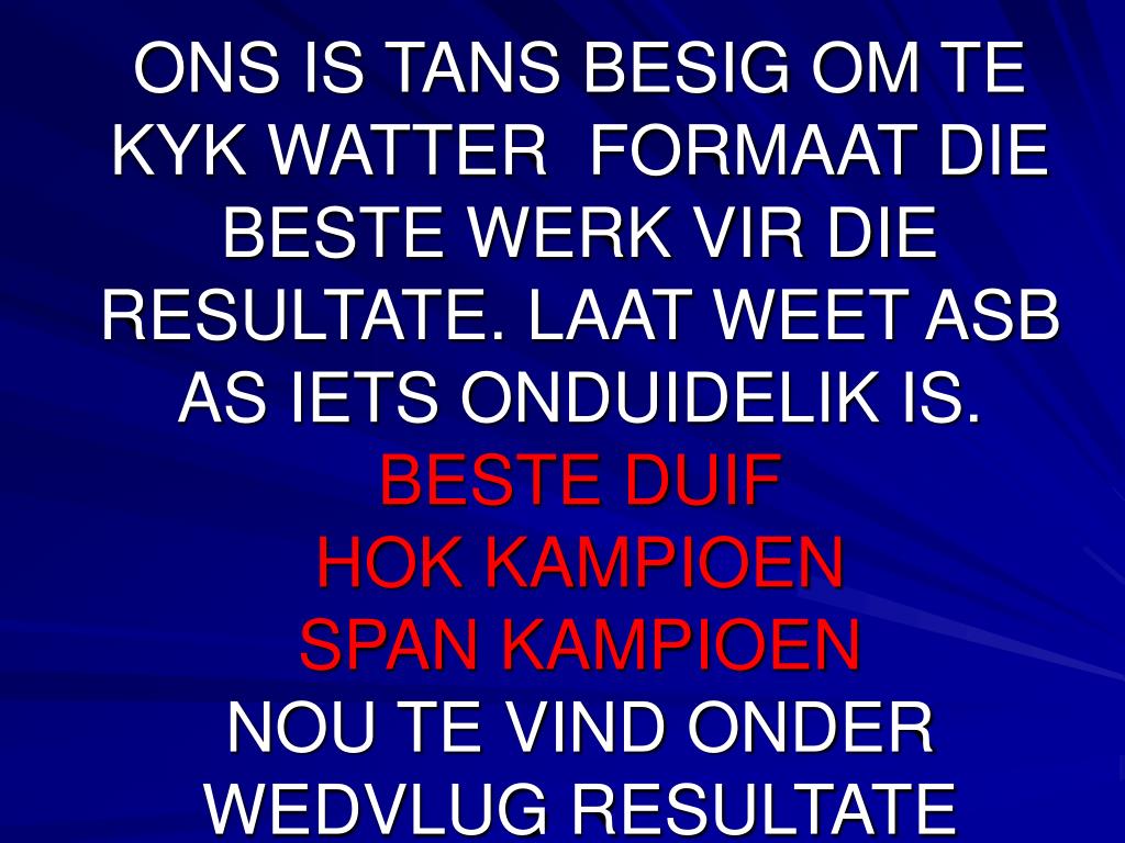 ONS IS TANS BESIG OM TE KYK WATTER FORMAAT DIE BESTE WERK VIR DIE RESULTATE. LAAT WEET ASB AS IETS ONDUIDELIK IS. BESTE DUIF HOK KAMPIOEN SPAN KAMPIOEN NOU TE VIND ONDER WEDVLUG RESULTATE.