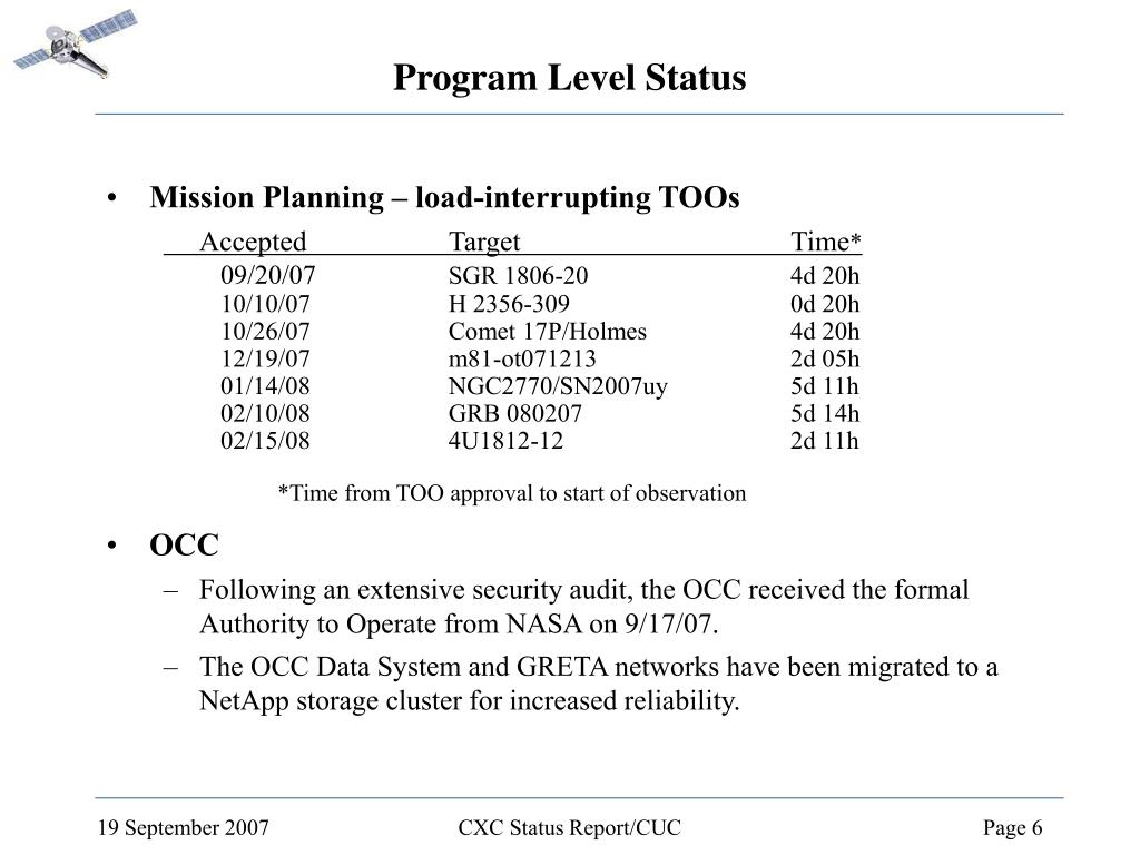 Program Level Status • Mission Planning – load-interrupting TOOs Accepted Target Time* 09/20/07 SGR 1806-204d 20h 10/10/07 H 2356-309 0d 20h 10/26/07 Comet 17P/Holmes 4d 20h 12/19/07 m81-ot071213 2d 05h 01/14/08 NGC2770/SN2007uy 5d 11h 02/10/08 GRB 080207 5d 14h 02/15/08 4U1812-12 2d 11h • *Time from TOO approval to start of observation • OCC • Following an extensive security audit, the OCC received the formal Authority to Operate from NASA on 9/17/07. • The OCC Data System and GRETA networks have been migrated to a NetApp storage cluster for increased reliability. CXC Status Report/CUC