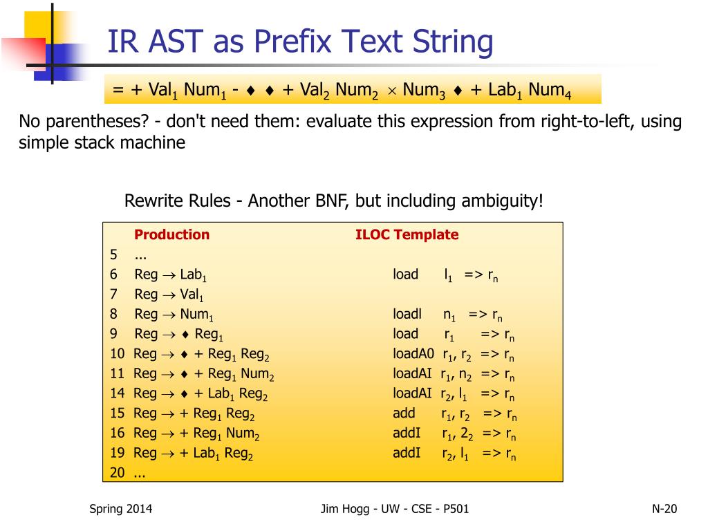 IR AST as Prefix Text String = + Val1 Num1 - + Val2 Num2 Num3 + Lab1 Num4 No parentheses? - don't need them: evaluate this expression from right-to-left, using simple stack machine Production ILOC Template 5 ... 6 Reg Lab1 load l1 => rn 7Reg Val1 8 Reg Num1loadl n1 => rn 9 Reg Reg1 load r1 => rn 10 Reg + Reg1 Reg2loadA0 r1, r2 => rn 11 Reg + Reg1 Num2loadAI r1, n2 => rn 14Reg + Lab1 Reg2loadAI r2, l1 => rn 15Reg + Reg1 Reg2add r1, r2 => rn 16 Reg + Reg1 Num2addI r1, 22=> rn 19 Reg + Lab1 Reg2addI r2, l1 => rn 20 ... Rewrite Rules - Another BNF, but including ambiguity! Jim Hogg - UW - CSE - P501