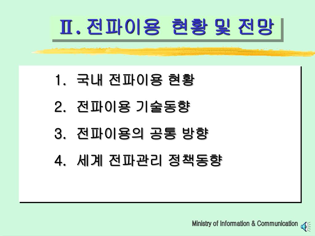 Ⅱ. 전파이용 현황 및 전망 1. 국내 전파이용 현황 2. 전파이용 기술동향 3. 전파이용의 공통 방향 4. 세계 전파관리 정책동향