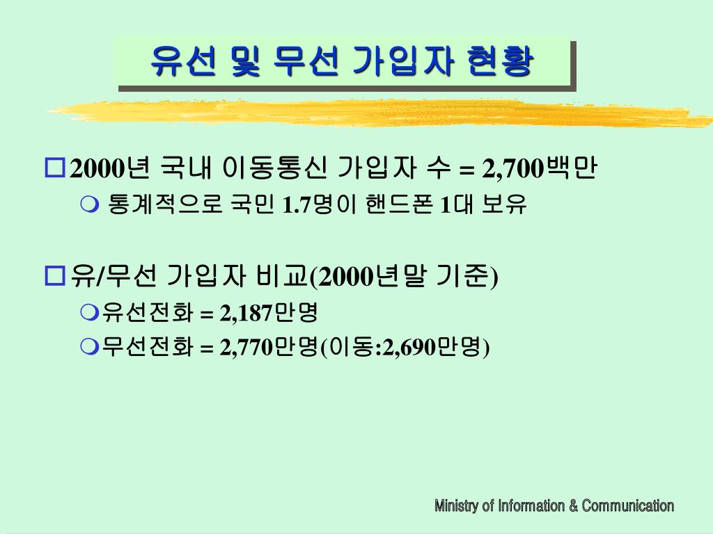 유선 및 무선 가입자 현황 • 2000년 국내 이동통신 가입자 수 = 2,700백만 • 통계적으로 국민 1.7명이 핸드폰 1대 보유 • 유/무선 가입자 비교(2000년말 기준) • 유선전화 = 2,187만명 • 무선전화 = 2,770만명(이동:2,690만명)